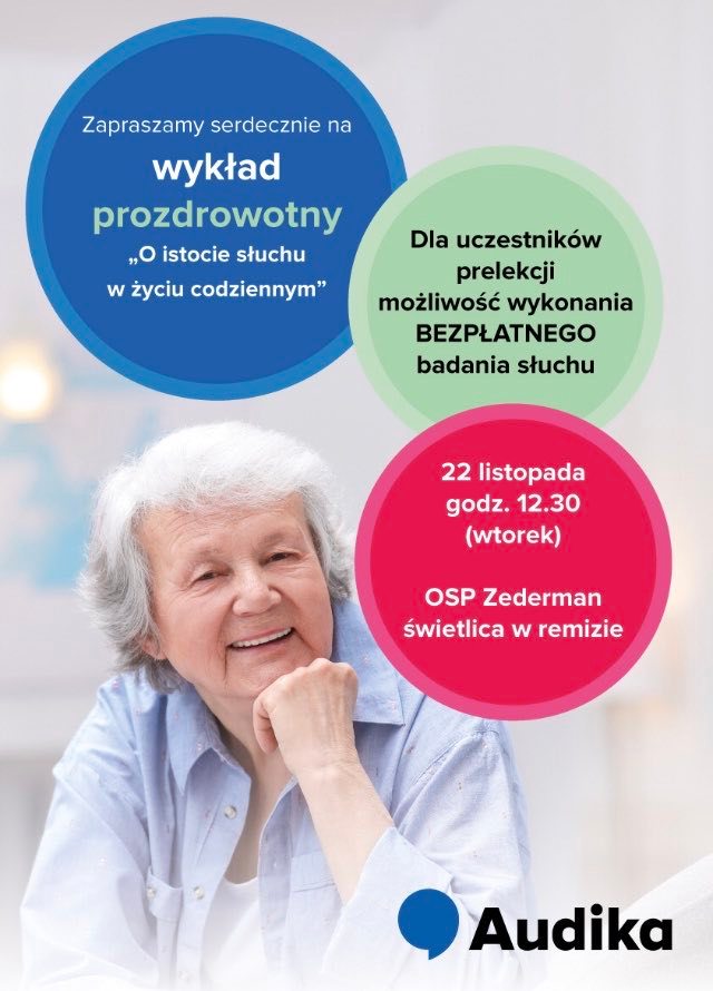 22 listopada 2022 r. (wtorek) w remizie OSP Zederman odbędzie się wykład prozdrowotny "O istocie słuchu w życiu codziennym". Po prelekcji uczestnicy będą mogli BEZPŁATNIE zbadać słuch.
